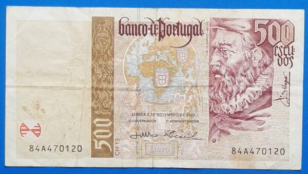 Issuance: This particular 500 Escudos note belongs to the 1997-2000 series and was issued by the Banco de Portugal.