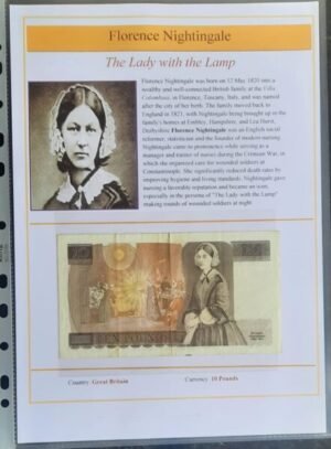 Known as “The Lady with the Lamp” for making nightly rounds to comfort and care for injured soldiers, Nightingale became a symbol of compassion and dedication. Her efforts established nursing as a vital and professional field, and her legacy continues to inspire healthcare worldwide. She is honored on the British £10 banknote.